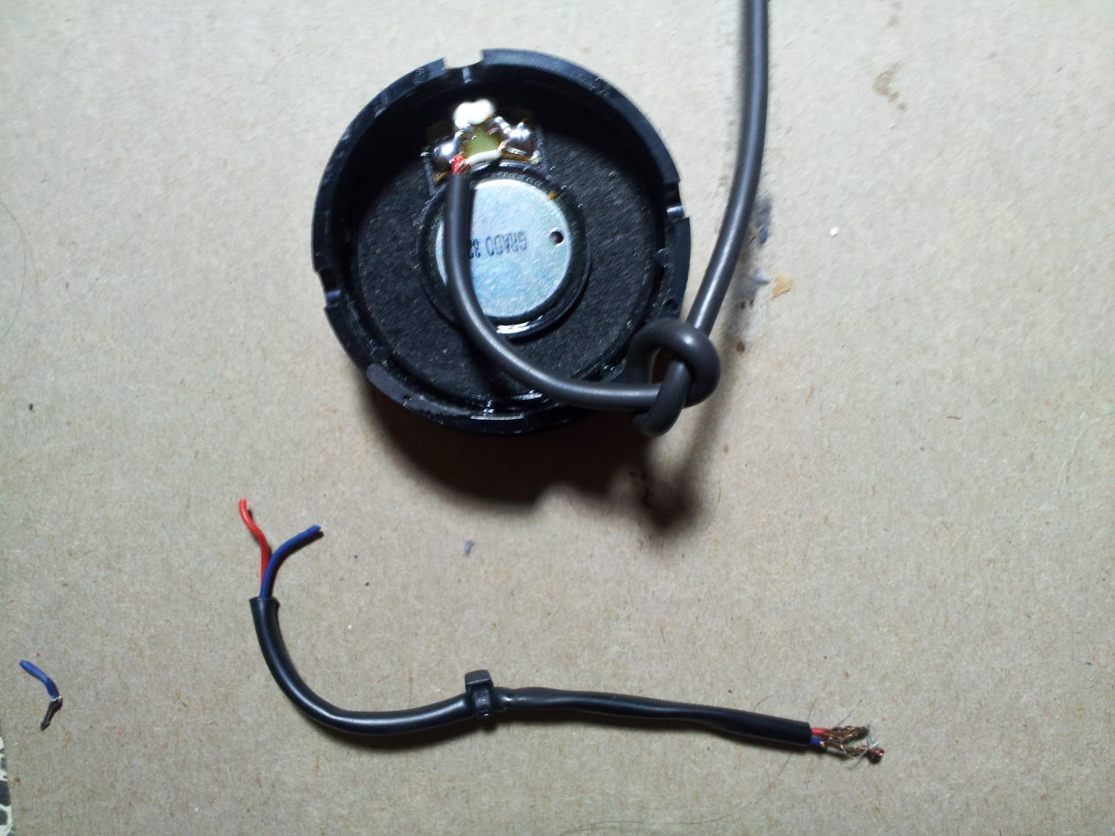 I figured the problem was a broken wire, so I held the cord with my hand and tilted my head to try and find where the wire was broken. I figured it was broken not far from the speaker itself, so I cut the wire to my headphones a few inches below it for good measure.